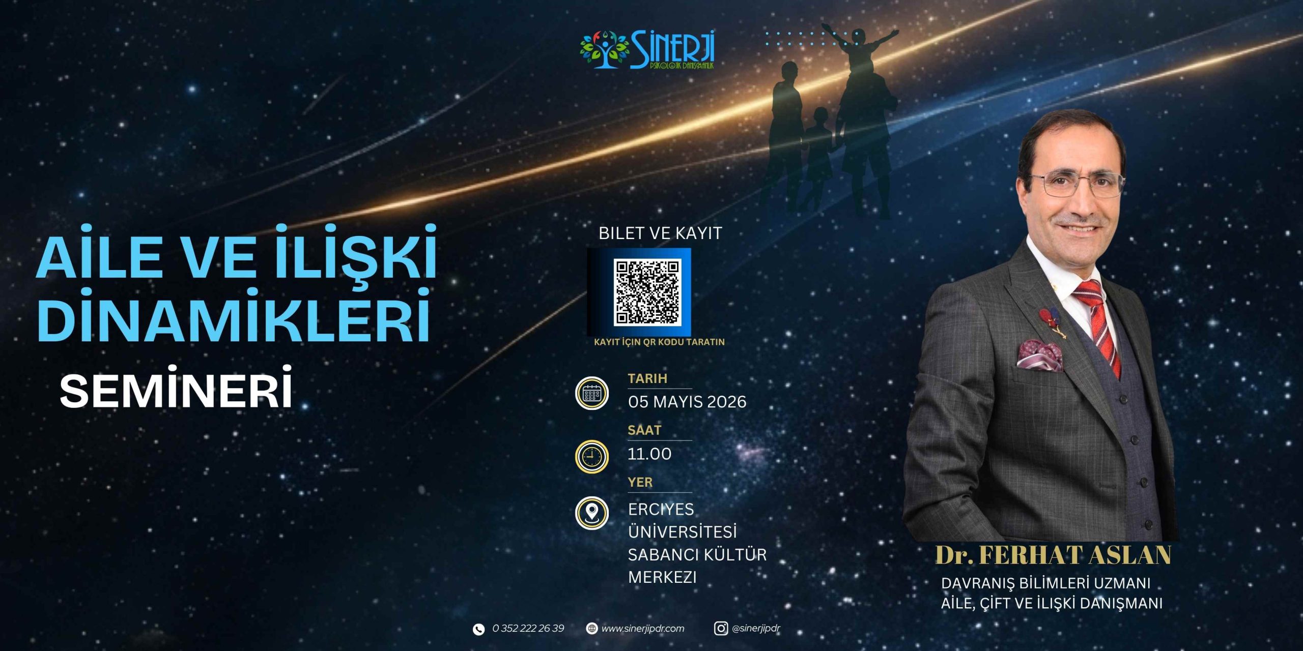 Sinerji PDR olarak, Davranış Bilimleri Uzmanı Dr. Ferhat Aslan’ı ağırlıyoruz. Modern aile yapısında iletişimin şifrelerini çözeceğimiz bu özel seminer, 5 Mayıs’ta Erciyes Üniversitesi Sabancı Kültür Merkezi’nde gerçekleşecek. Sınırlı kontenjan için yerinizi şimdiden ayırtın.